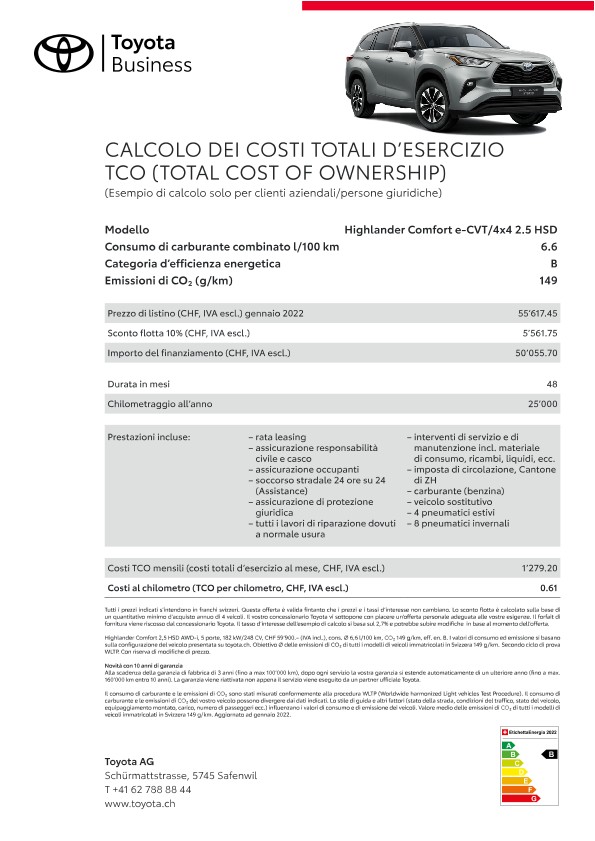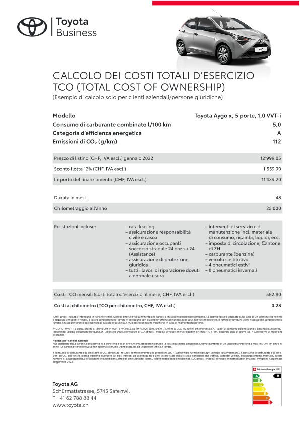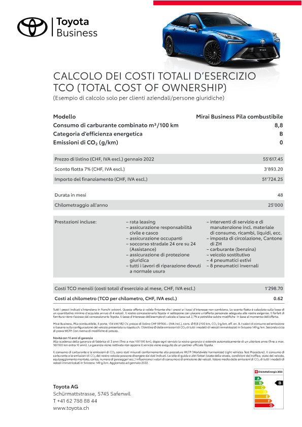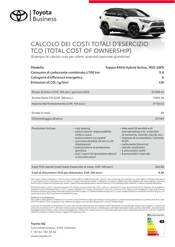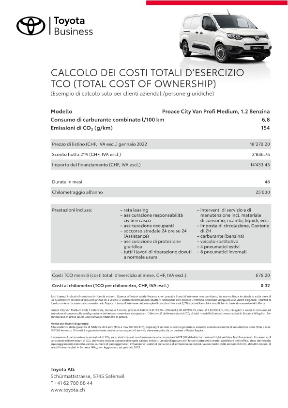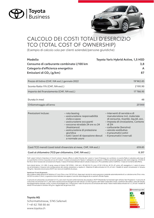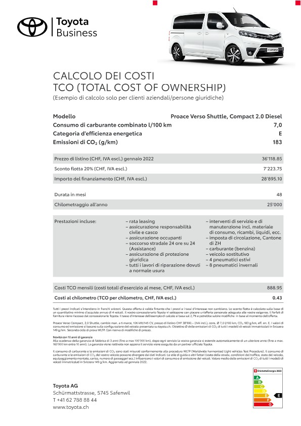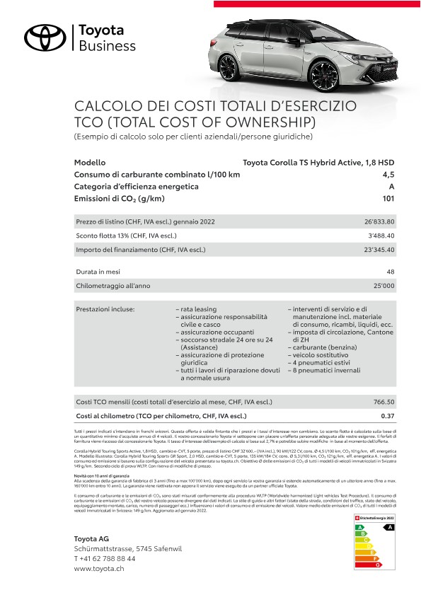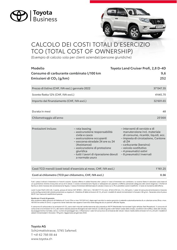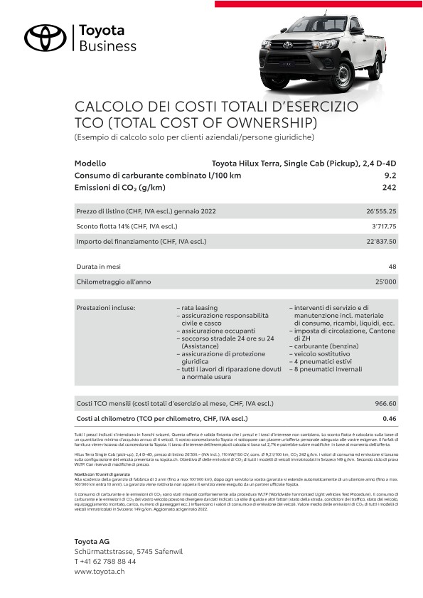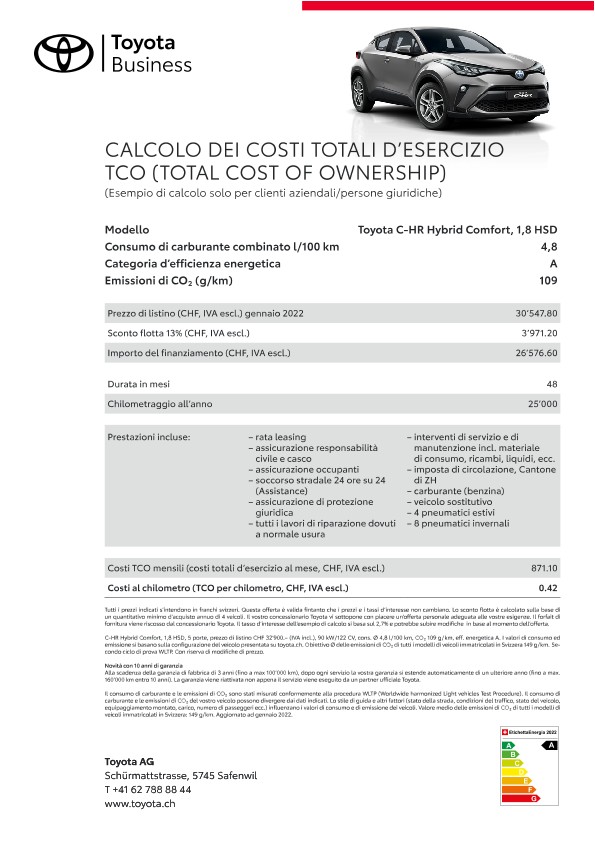 Grazie alle loro qualità e affidabilità straordinarie i veicoli flotta Toyota mantengono anche dopo anni un valore di rivendita elevato. Il servizio a regola d’arte dei concessionari Toyota, appositamente formati sulla specificità della marca, contribuisce al mantenimento del valore dell’auto. Un ulteriore fattore di riduzione dei costi sono le nostre tecnologie propulsive e di tecnica dei motori innovative come ad esempio la propulsione ibrida pura e Toyota Optimal Drive, che riducono il consumo di carburante.